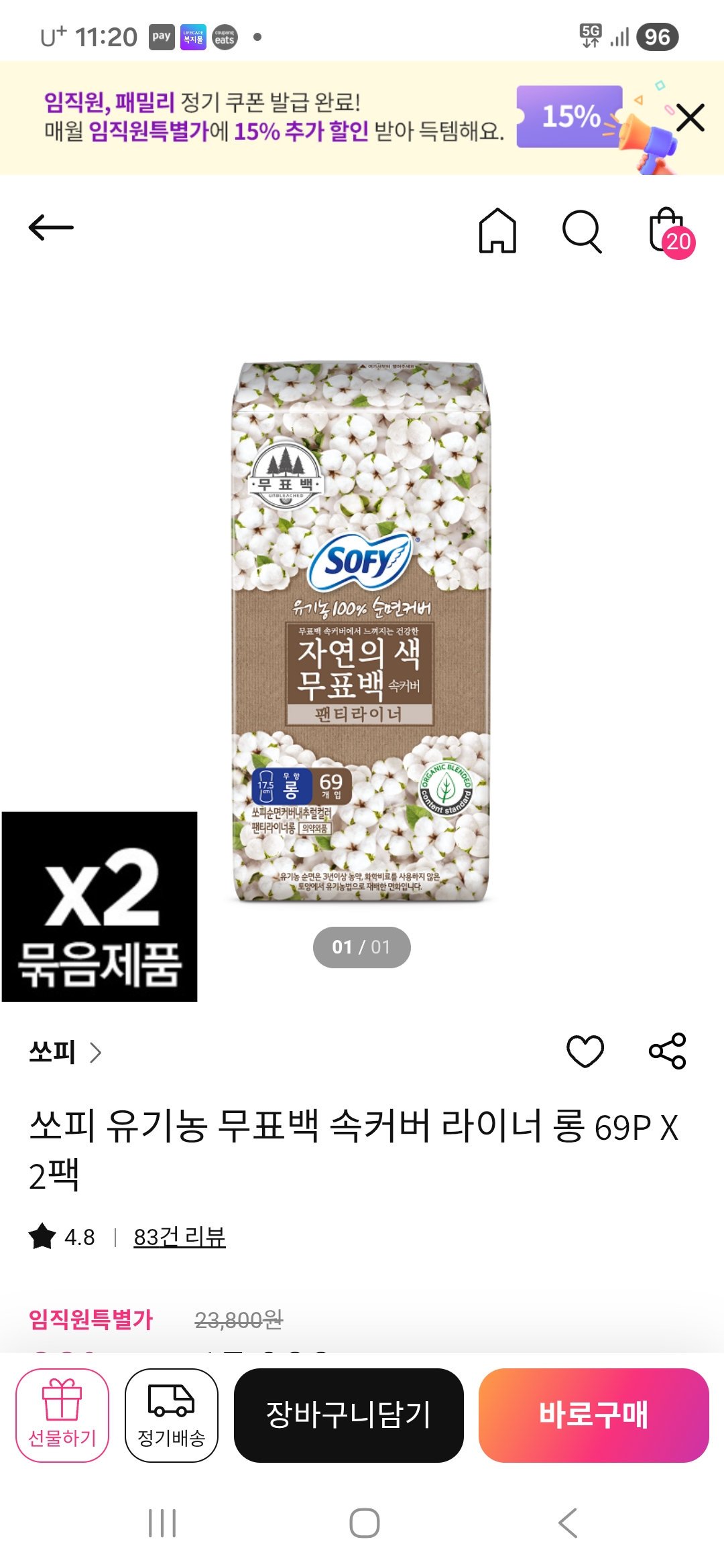 쏘피 유기농 무표백 속커버 라이너 롱 69P X 2팩