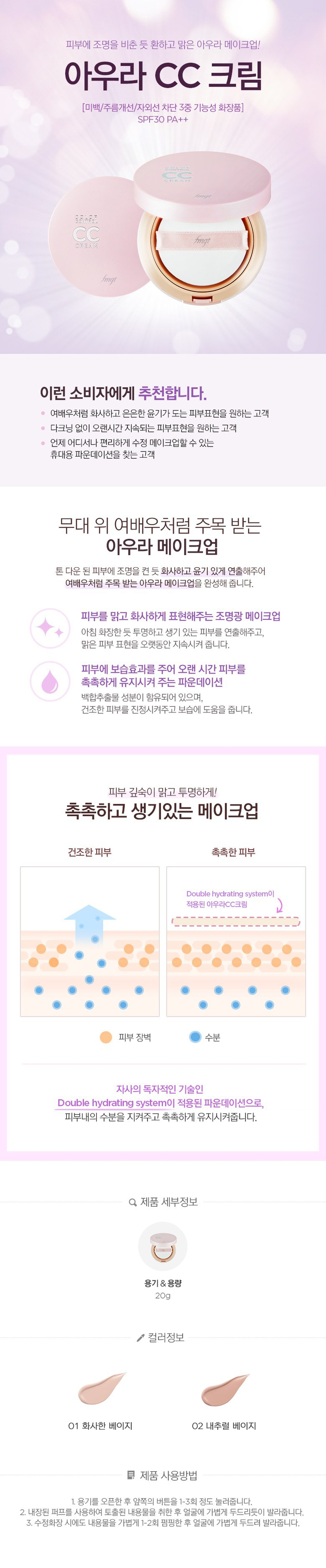 | 사용방법 | 1. 용기를 오픈한 후 앞쪽의 버튼을 1~3회 정도 눌러줍니다. 2. 내장된 퍼프를 사용하여 토출된 내용물을 취한 후 얼굴에 가볍게 두드리듯이 발라줍니다. 3. 수정화장 시에도 내용물을 가볍게 1~2회 펌핑한 후 얼굴에 가볍게 두드려 발라줍니다.