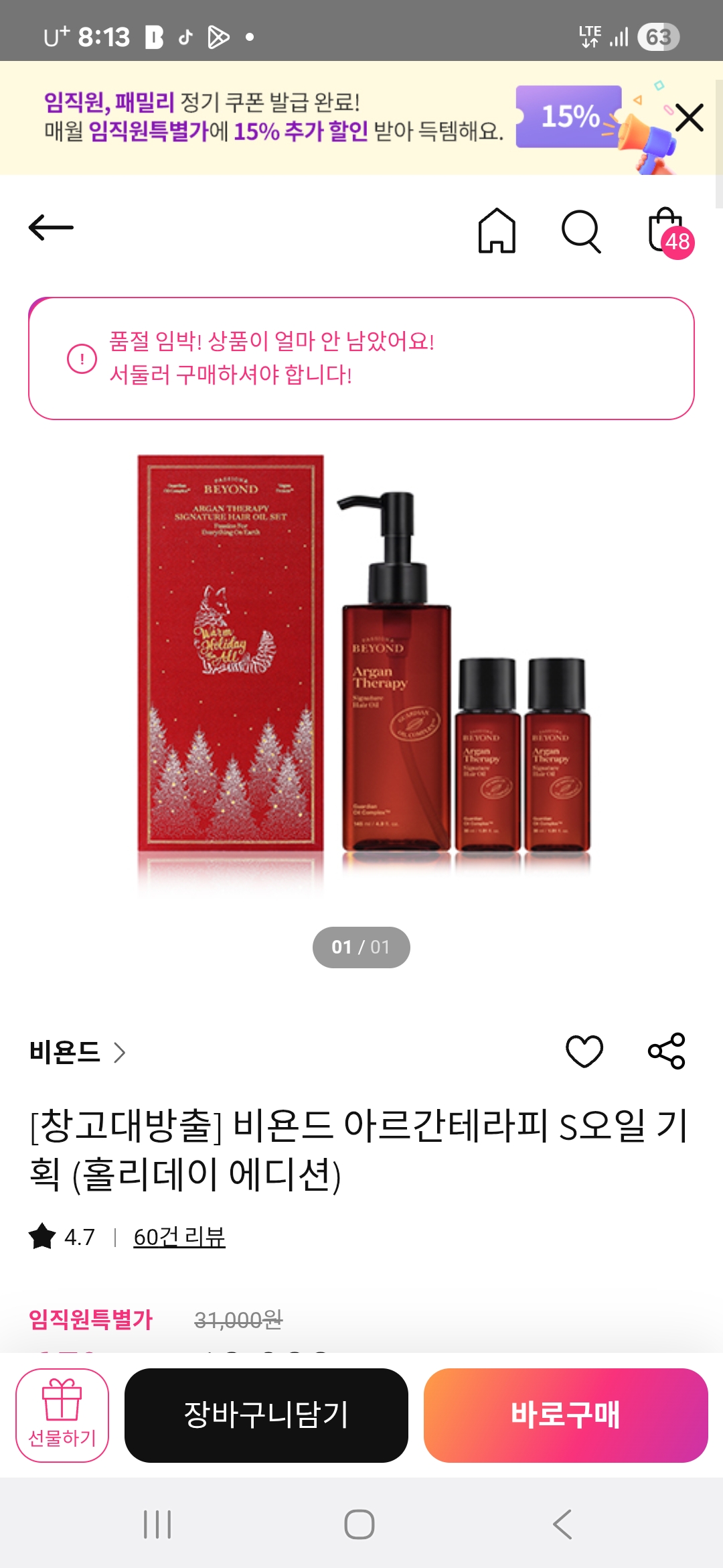 | 화장품법에 따라 기재·표시하여야 하는 모든 성분 | 다이메티콘, 아이소도데케인, 카프릴릭/카프릭트라이글리세라이드, 다이메티콘올, 다이카프릴릴에터, 해바라기씨오일, 아르간커넬오일(5,000 ppm), 베타-카로틴, 당근추출물, 당근씨오일, 토코페롤, 정제수, 코코넛야자오일, 쿠푸아수씨버터, 올리브오일, 콜레스테롤, 부틸렌글라이콜, 하이드로제네이티드레시틴, 변성알코올, 콜라겐, 데사미도콜라겐, 트라이메틸실록시실리케이트, 1,2-헥산다이올, 향료, 리모넨, 하이드록시시트로넬알, 헥실신남알, 리날룰 |