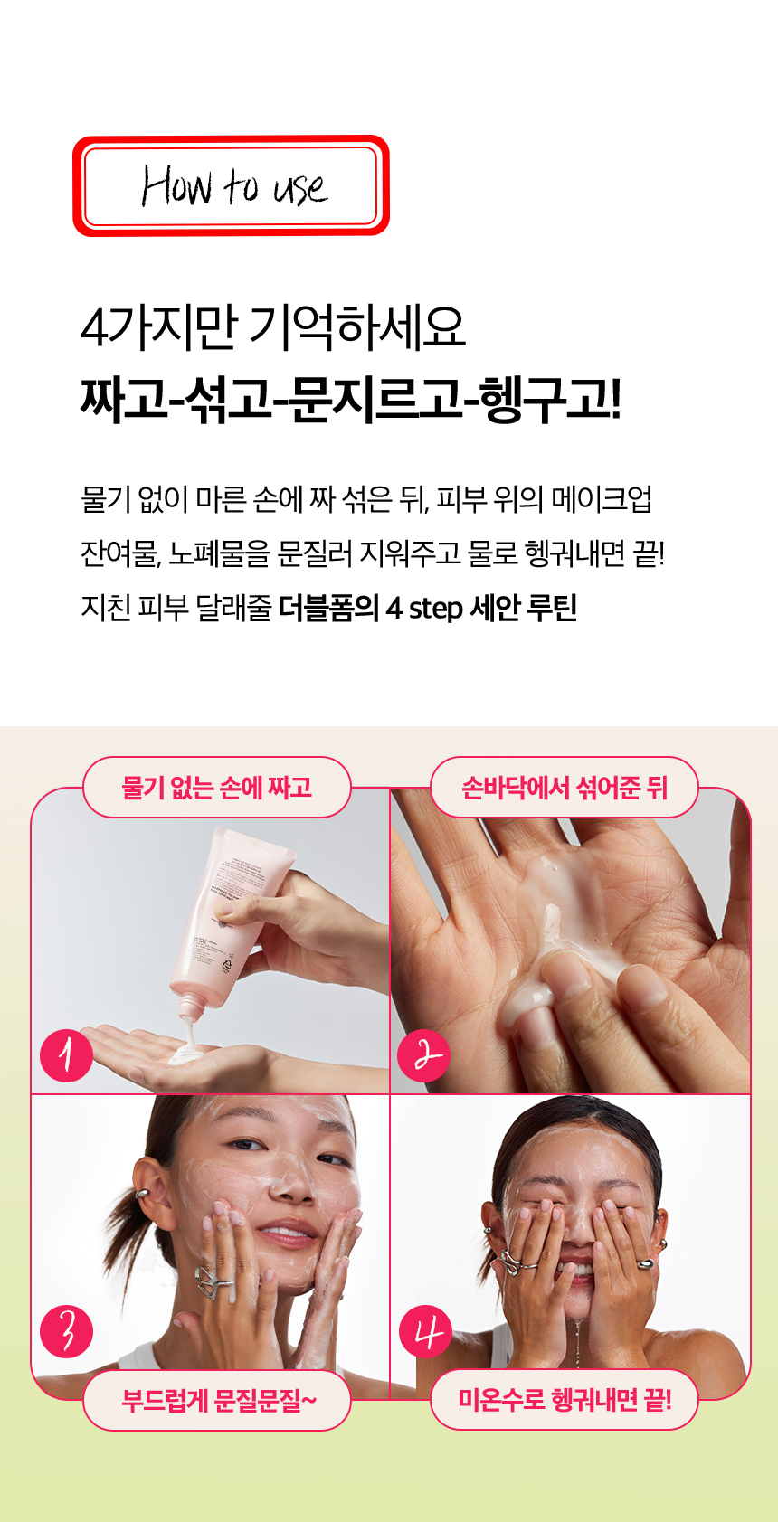 | 사용방법 | 튜브 중앙을 눌러 토출된 두 가지 제형을 손바닥으로 문질러 마른 얼굴에 부드럽게 마사지하듯 롤링한 뒤 미온수로 깨끗하게 헹구어냅니다. |