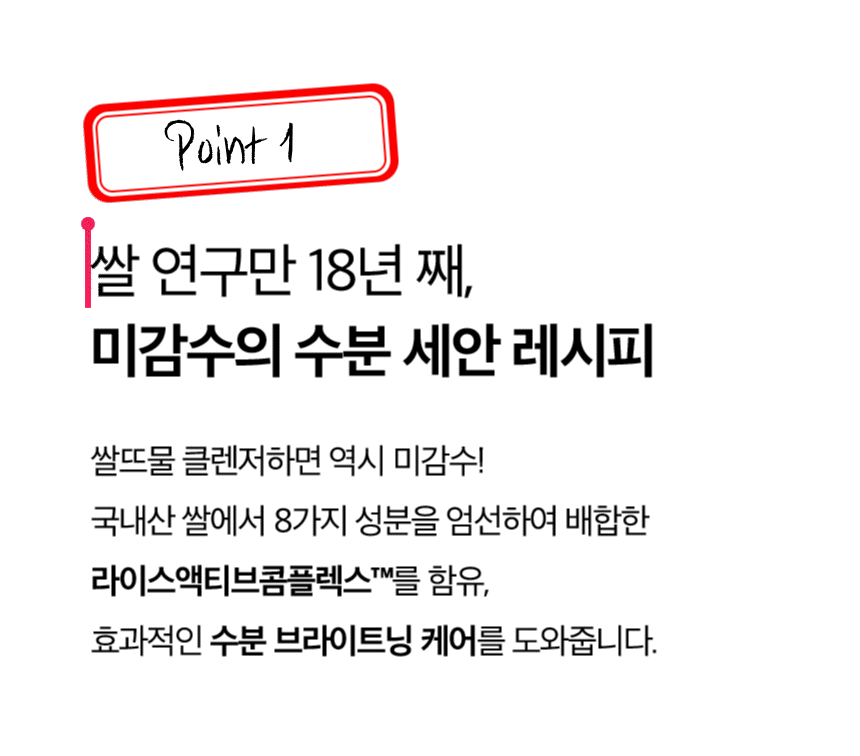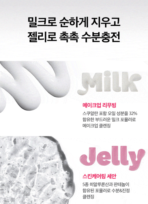 | 화장품법에 따라 기재·표시하여야 하는 모든 성분 | [클렌징 밀크] 정제수, 세틸에틸헥사노에이트, 라우릴하이드록시설테인, 스쿠알란, 글리세린, 아크릴레이트코폴리머, 코코-글루코사이드, 소듐클로라이드, 포타슘코코일글리시네이트, 카프릴릴글라이콜, 향료, 트로메타민, 다이소듐코코암포다이아세테이트, 소듐벤조에이트, 1,2-헥산다이올, 헥실렌글라이콜, 글리세릴올리에이트, 트라이소듐이디티에이, 시트릭애씨드, 부틸렌글라이콜, 효모/쌀발효여과물*, 하이드롤라이즈드소듐하이알루로네이트, 하이드롤라이즈드하이알루로닉애씨드, 하이드롤라이즈드쌀추출물*, 하이드롤라이즈드쌀단백질*, 하이드록시프로필트라이모늄하이알루로네이트, 쌀겨오일*, 쌀배아오일*, 쌀배아추출물*, 쌀아미노산*, 펜틸렌글라이콜, 쌀추출물*, 에틸헥실글리세린, 소듐하이알루로네이트, 소듐하이알루로네이트크로스폴리머, 수용성프로테오글리칸 [클렌징 젤리] 정제수, 글리세린, 소듐코코일알라니네이트, 폴리글리세릴-4카프레이트, 1,2-헥산다이올, 다이소듐코코일글루타메이트, 잔탄검, 라우릴하이드록시설테인, 향료, 소듐코코일글루타메이트, 시트릭애씨드, 소듐클로라이드, 트라이소듐이디티에이, 판테놀, 부틸렌글라이콜, 효모/쌀발효여과물*, 하이드롤라이즈드소듐하이알루로네이트, 하이드롤라이즈드하이알루로닉애씨드, 하이드롤라이즈드쌀추출물*, 하이드롤라이즈드쌀단백질*, 하이드록시프로필트라이모늄하이알루로네이트, 쌀겨오일*, 쌀배아오일*, 쌀배아추출물*, 쌀아미노산*, 펜틸렌글라이콜, 쌀추출물*, 에틸헥실글리세린, 소듐하이알루로네이트, 소듐하이알루로네이트크로스폴리머, 수용성프로테오글리칸 |