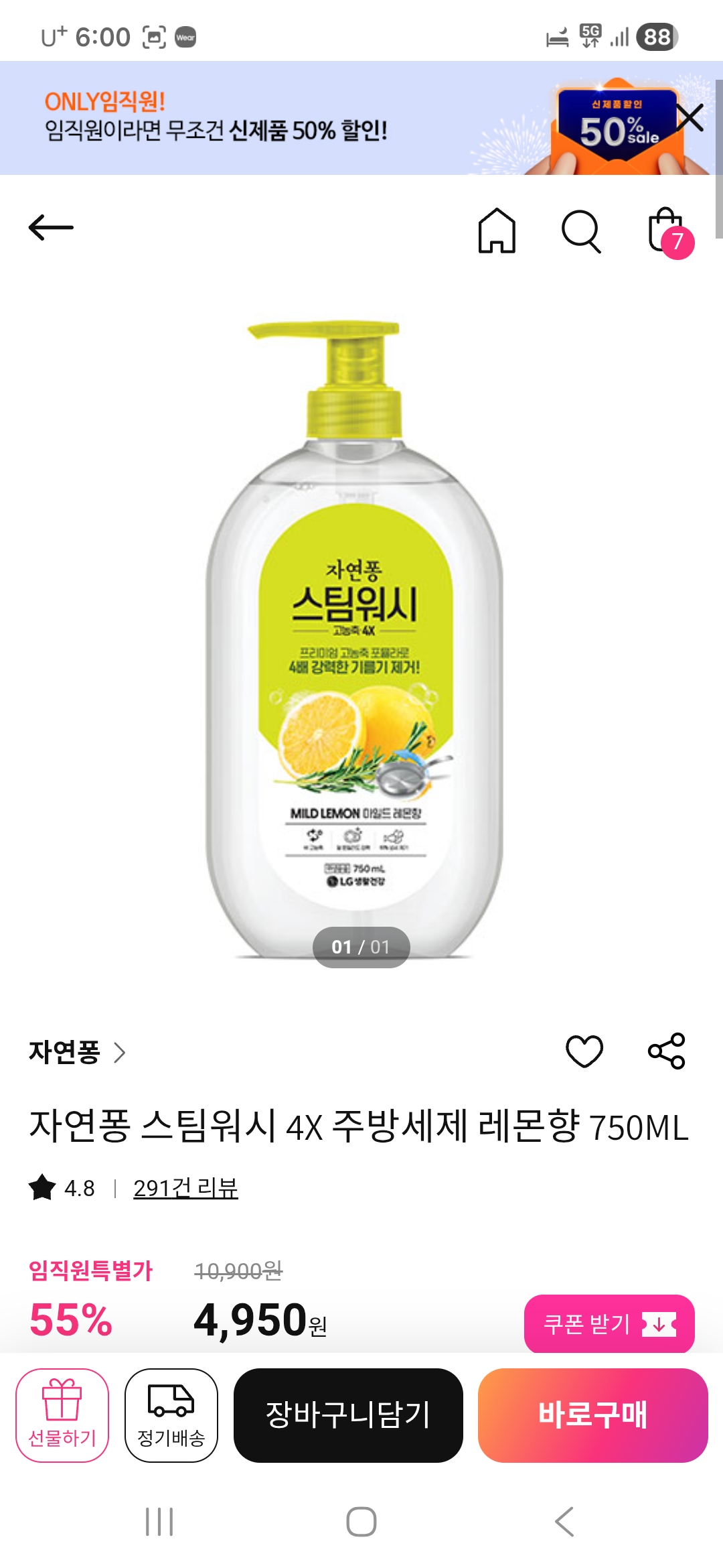 자연퐁 스팀워시 4X 주방세제 2종 (옵션선택)