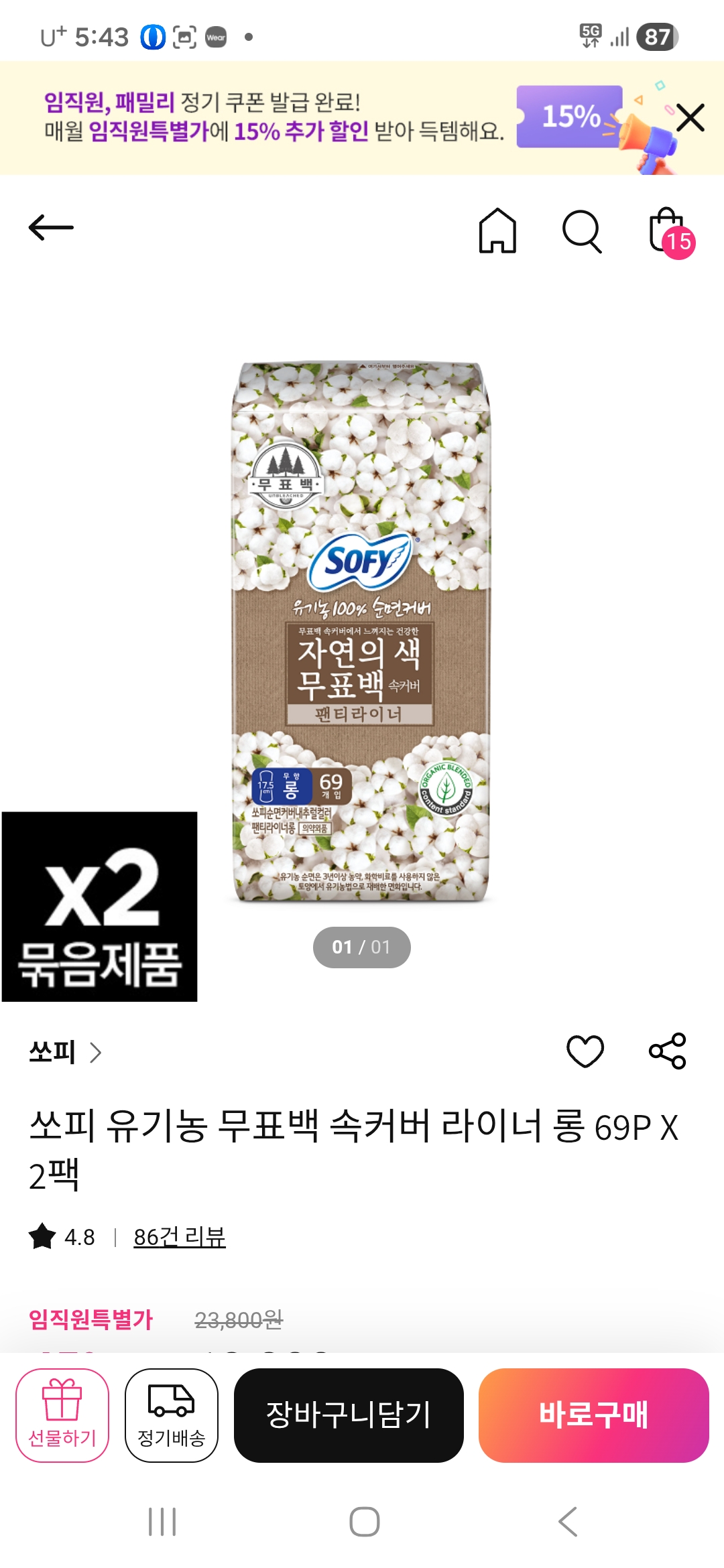 쏘피 유기농 무표백 속커버 라이너 롱 69P X 2팩