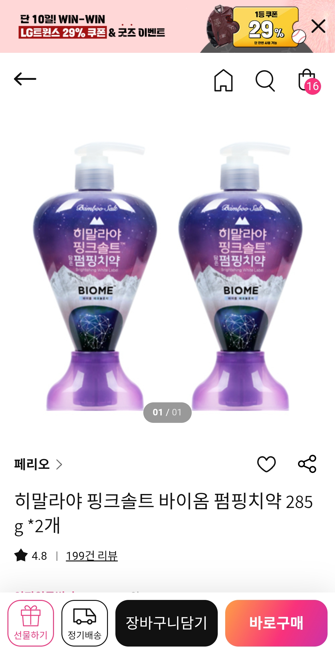 히말라야 핑크솔트 바이옴 펌핑치약 285g *2개