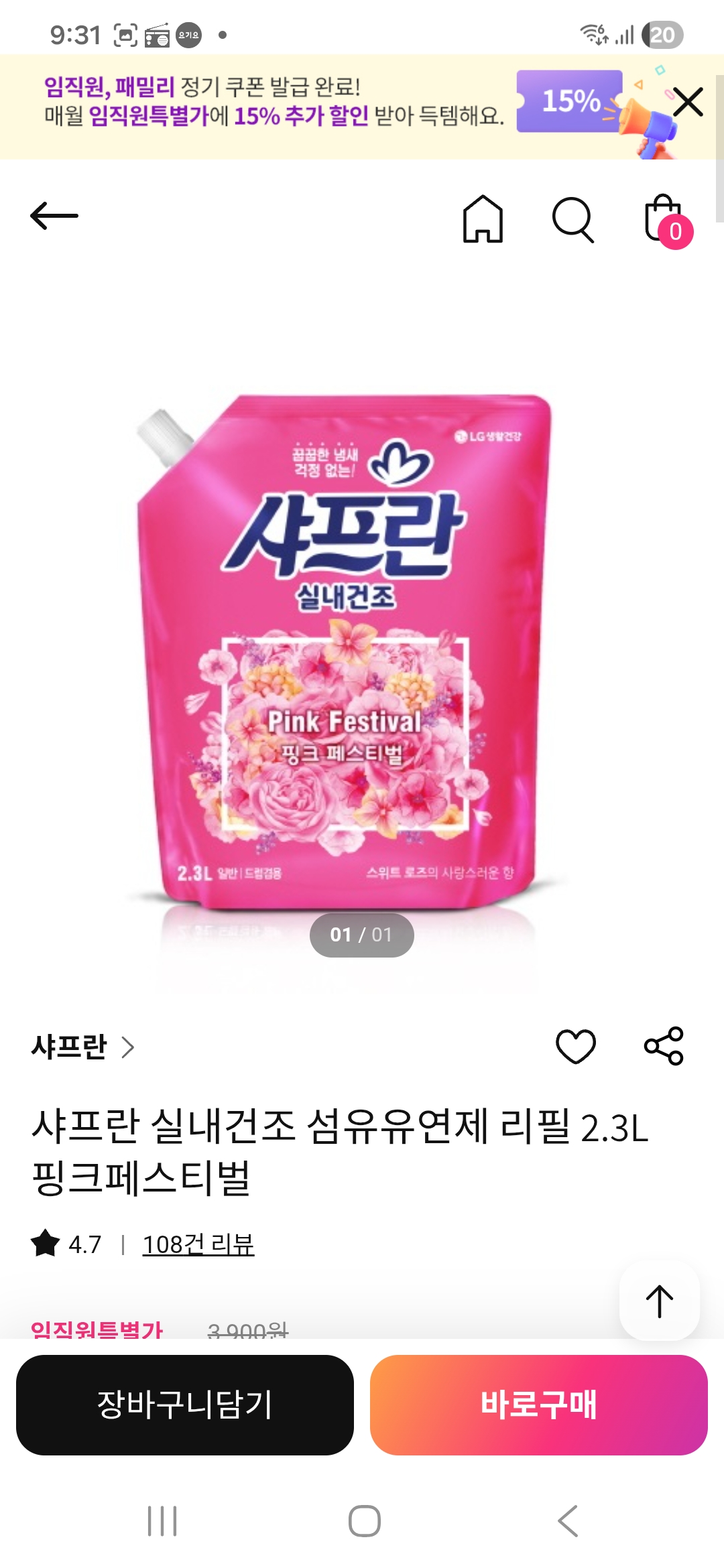 샤프란 실내건조 섬유유연제 리필 2.3L 핑크페스티벌
