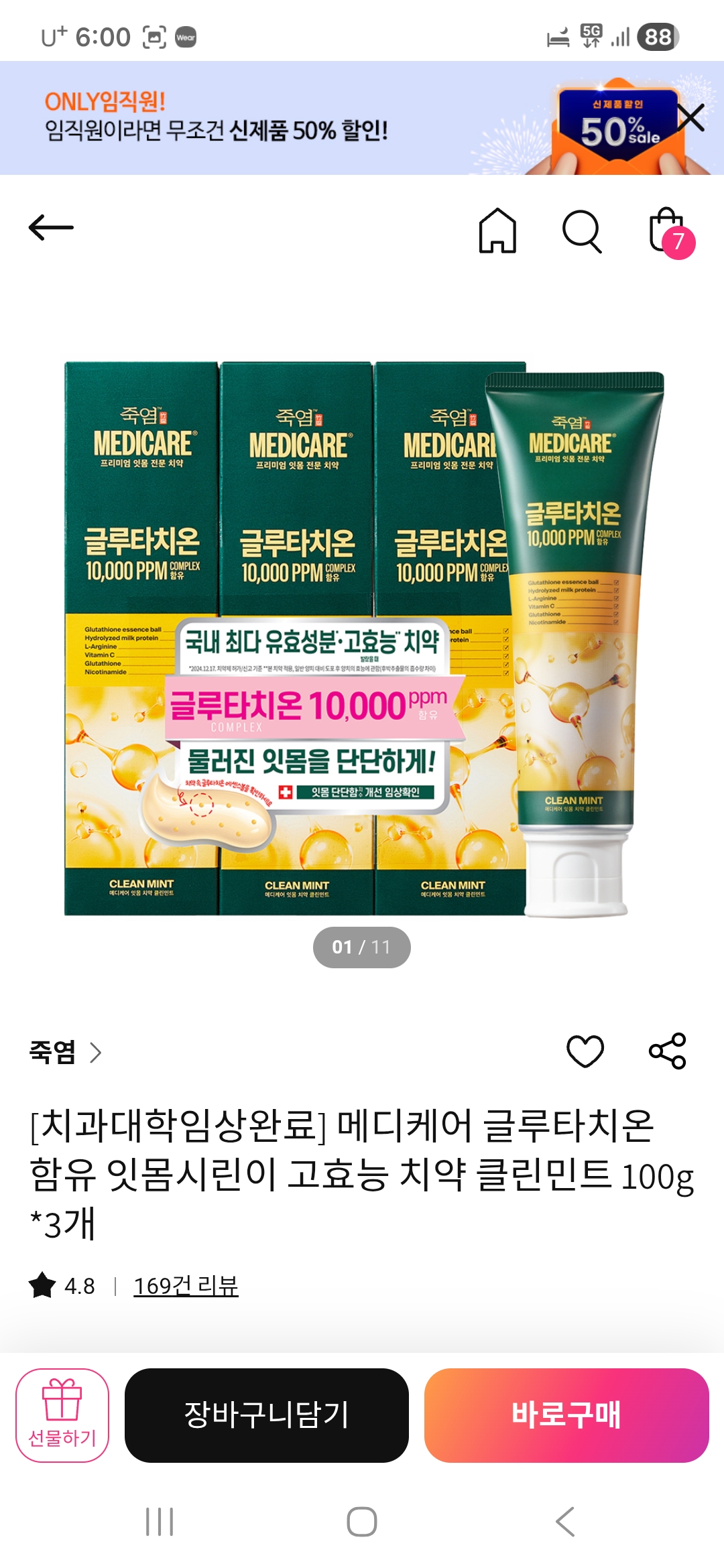 [치과대학임상완료] 메디케어 글루타치온 함유 잇몸시린이 고효능 치약 클린민트 100g*3개