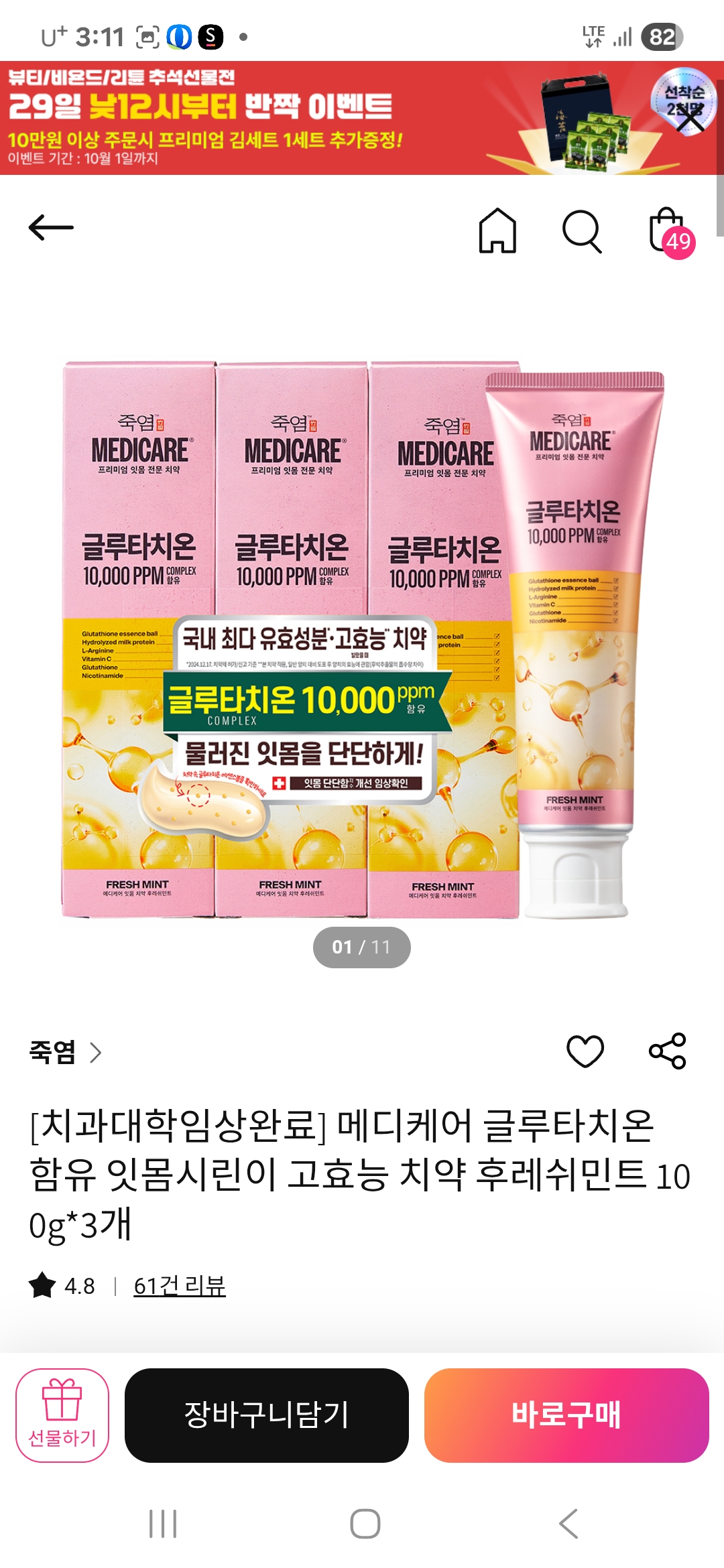 [치과대학임상완료] 메디케어 글루타치온 함유 잇몸시린이 고효능 치약 후레쉬민트 100g*3개