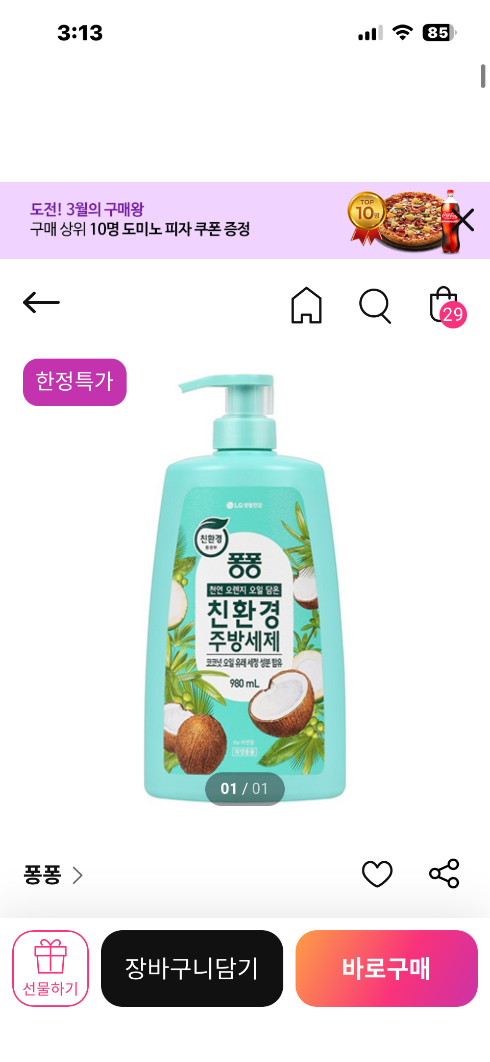 [창고대방출] 퐁퐁 친환경주방세제 코코넛 용기형 980ML*4개