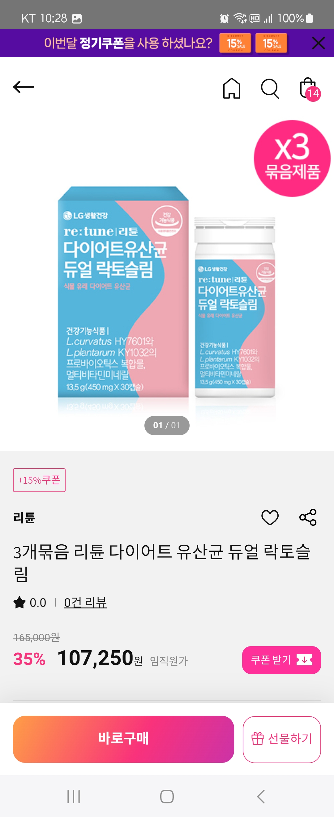 리튠 다이어트 유산균 듀얼 락토슬림 (30캡슐,1개월분) 3개